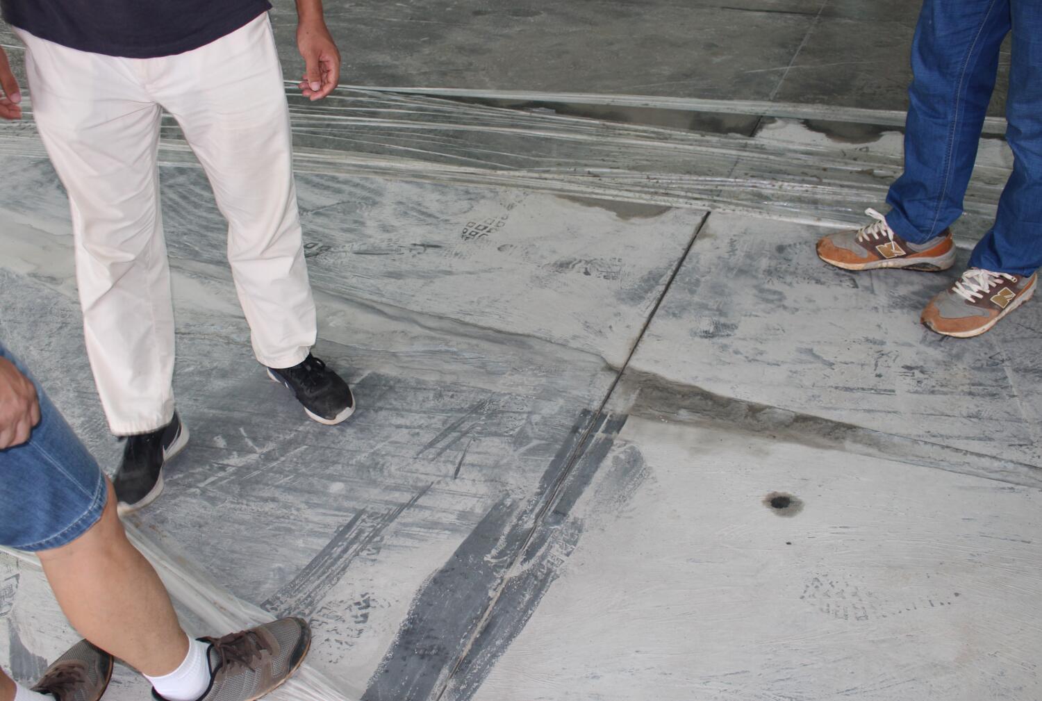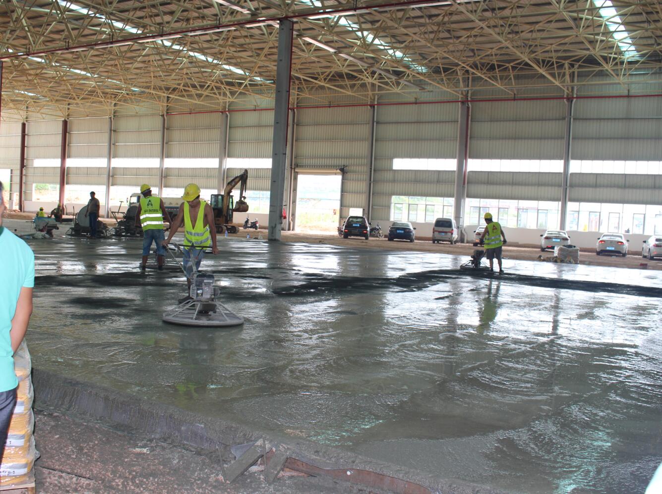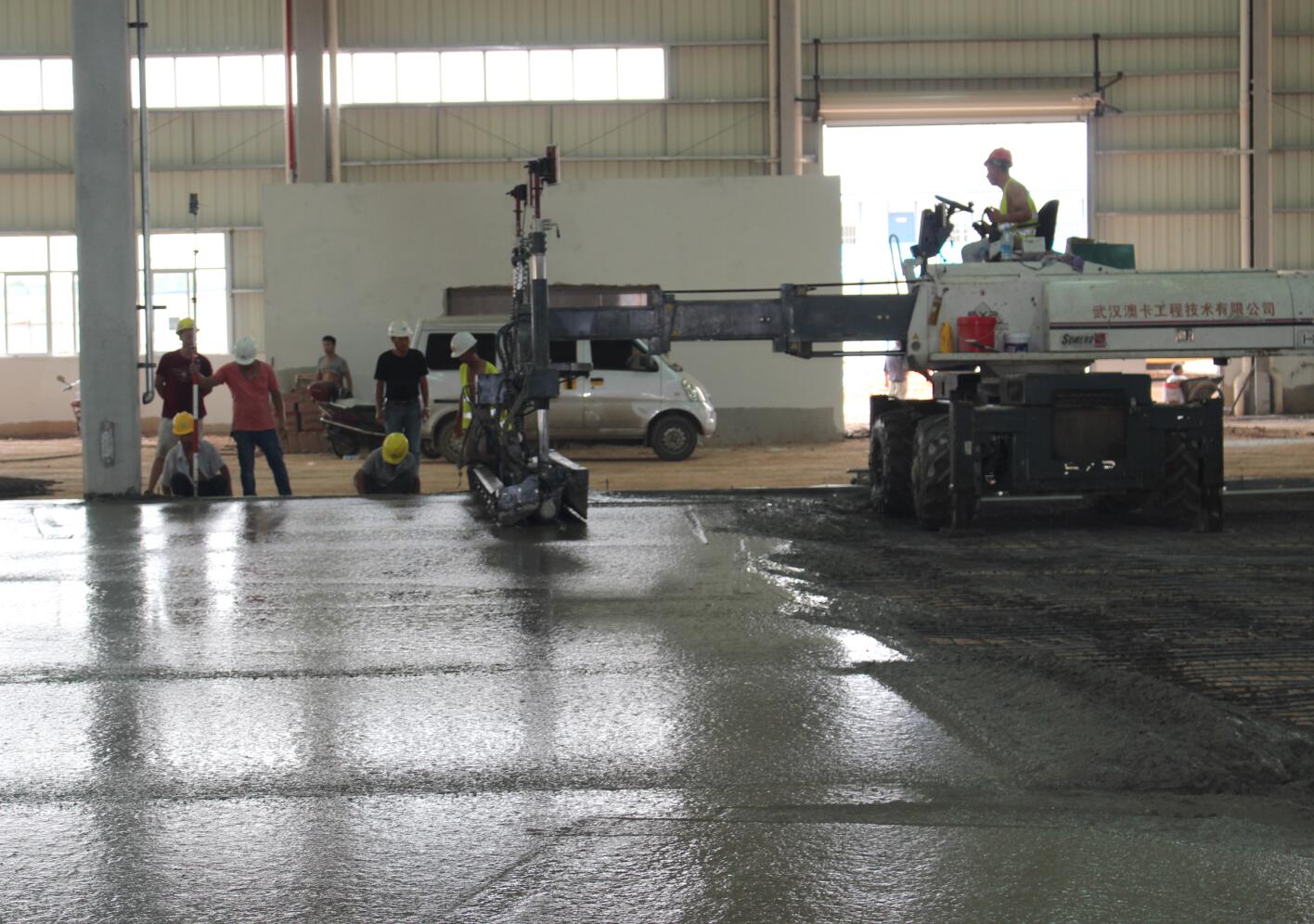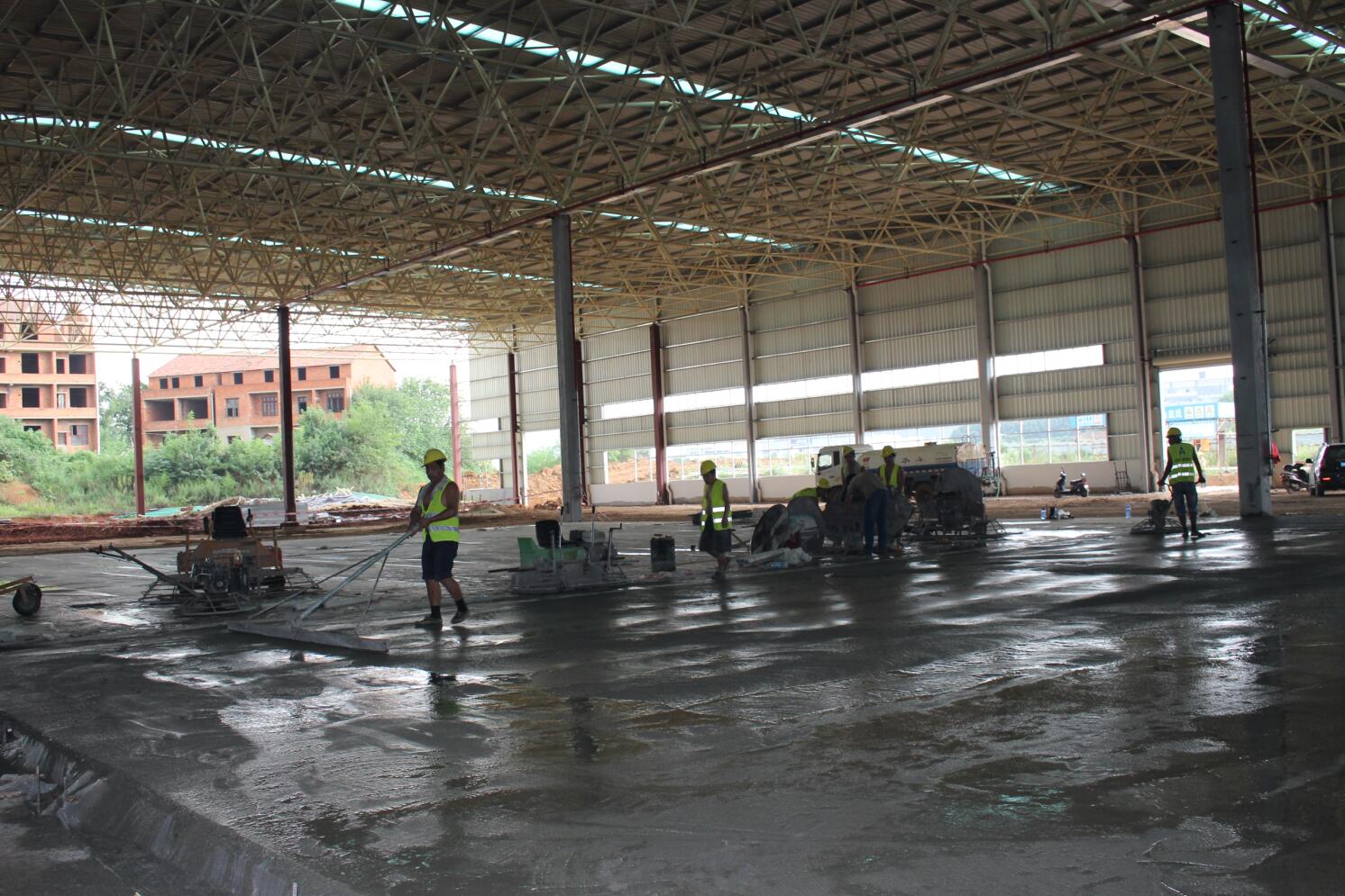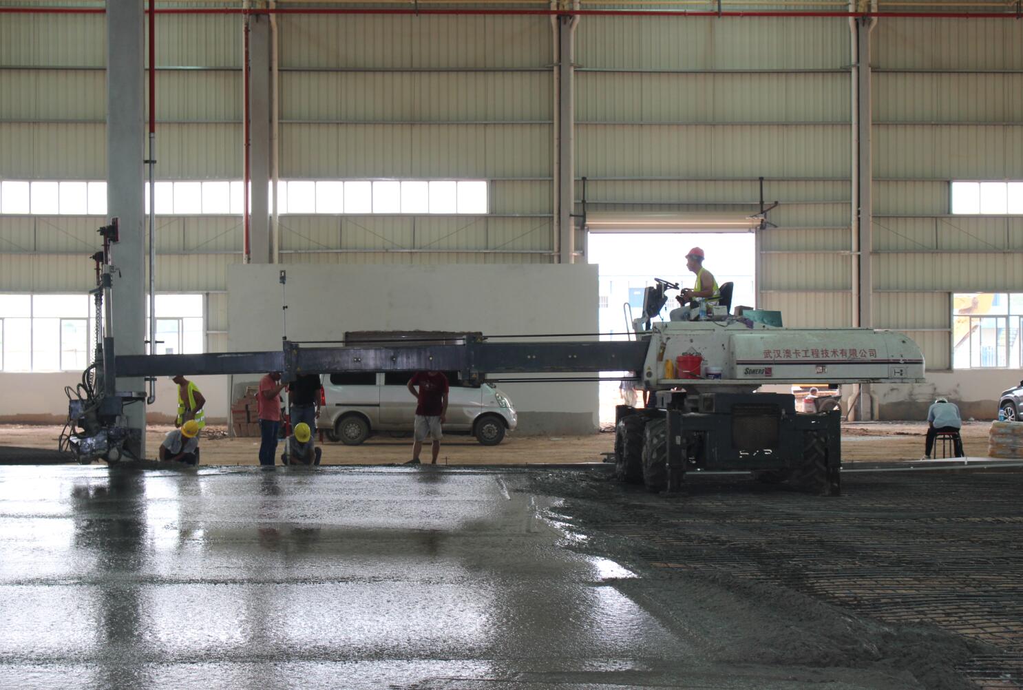 億和中建鋼構(gòu)項目率先在地平混凝土現(xiàn)場引進(jìn)激光振坪儀和磨光機(jī),不僅在效率上大大縮短了施工時間,降低了人工成本,更是在效果上達(dá)到了比人工更為精準(zhǔn)的技藝——混凝土的平整度、密實度、觀感度以及面層金剛砂顆粒分布度優(yōu)良,高低差控制在3~4mm。