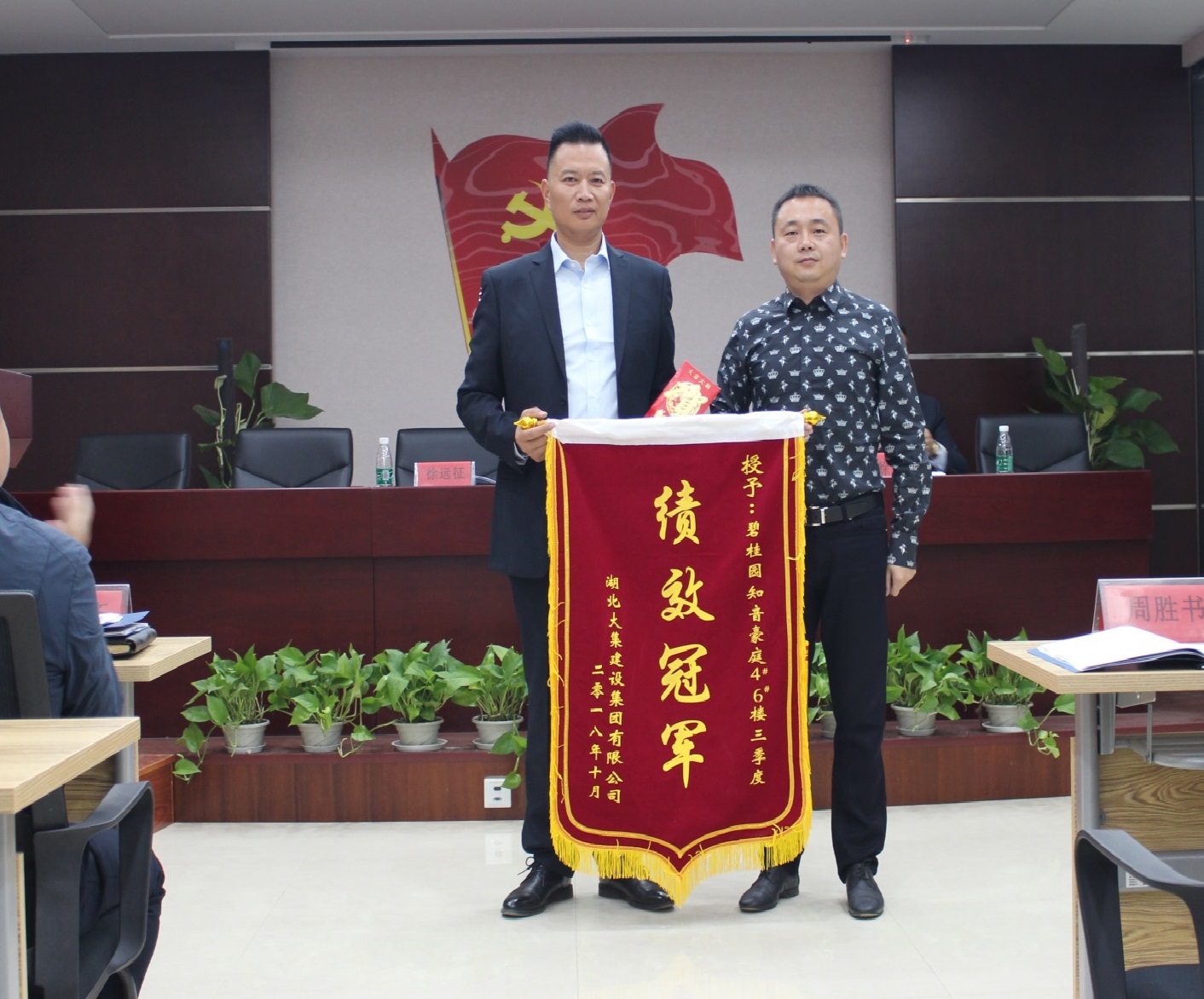 隨后,集團(tuán)董事長徐濤為此次績效考評中的冠軍項(xiàng)目——碧桂園4#、6#項(xiàng)目部頒發(fā)錦旗和獎金。