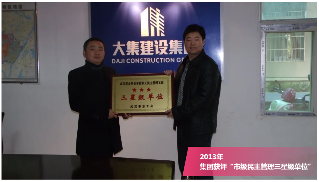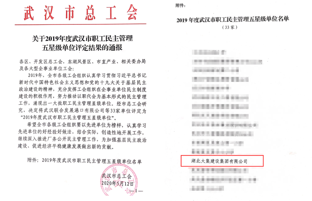 近日,武漢市總工會(huì)下發(fā)文件,湖北大集建設(shè)集團(tuán)通過(guò)復(fù)審評(píng)定,榮獲“2019年度武漢市職工民主管理五星級(jí)單位”榮譽(yù)稱號(hào),武漢市僅33家單位獲此殊榮。該項(xiàng)榮譽(yù)是武漢市企務(wù)公開民主管理工作最高級(jí)別的獎(jiǎng)項(xiàng),也是湖北大集建設(shè)在公司推行民主管理領(lǐng)域獲得的又一殊榮。