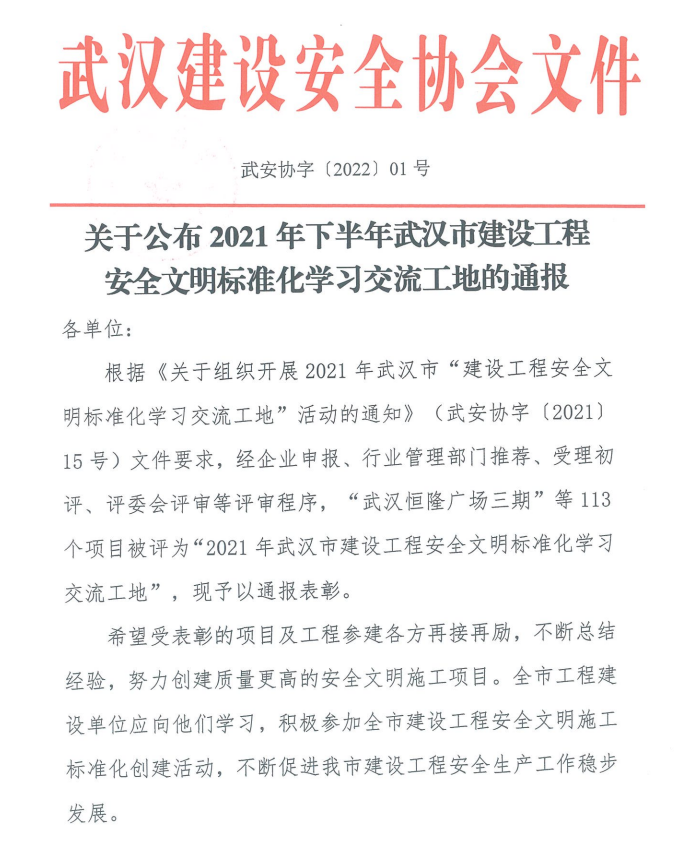近日,經(jīng)過申報、行業(yè)主管部門推薦、受理初評、評委會評審等多項(xiàng)評審程序后,集團(tuán)公司承建的武漢花博匯十二花坊項(xiàng)目(二期)獲評“2021年下半年武漢市建設(shè)工程安全文明標(biāo)準(zhǔn)化學(xué)習(xí)交流工地” 稱號。