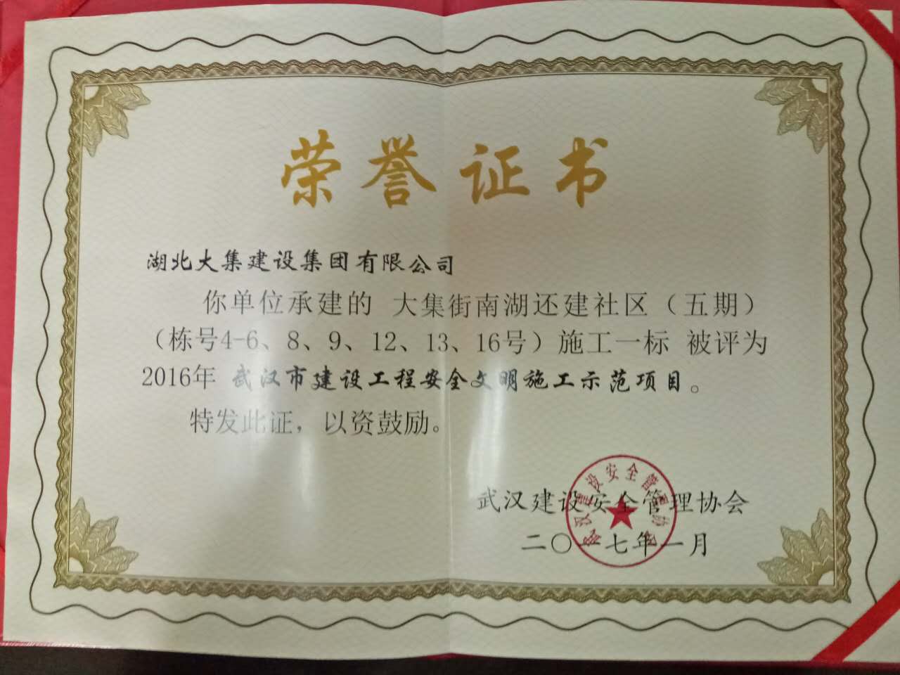 南湖五期項(xiàng)目繼4號樓、5號樓、6號樓,8號樓,9號樓、13號樓被上級監(jiān)管部門評定為“結(jié)構(gòu)優(yōu)質(zhì)“后,3月份項(xiàng)目部又獲得“湖北省優(yōu)秀建筑工地農(nóng)民工業(yè)余學(xué)?!睒s譽(yù)稱號,4月12日,南湖五期4號樓、5號樓、8號樓、9號樓、12號樓、13號樓、16號樓再次被武漢建設(shè)安全管理協(xié)會評為"武漢市建筑工程安全文明施工示范項(xiàng)目",為湖北大集建設(shè)集團(tuán)再贏回一座黃鶴杯!