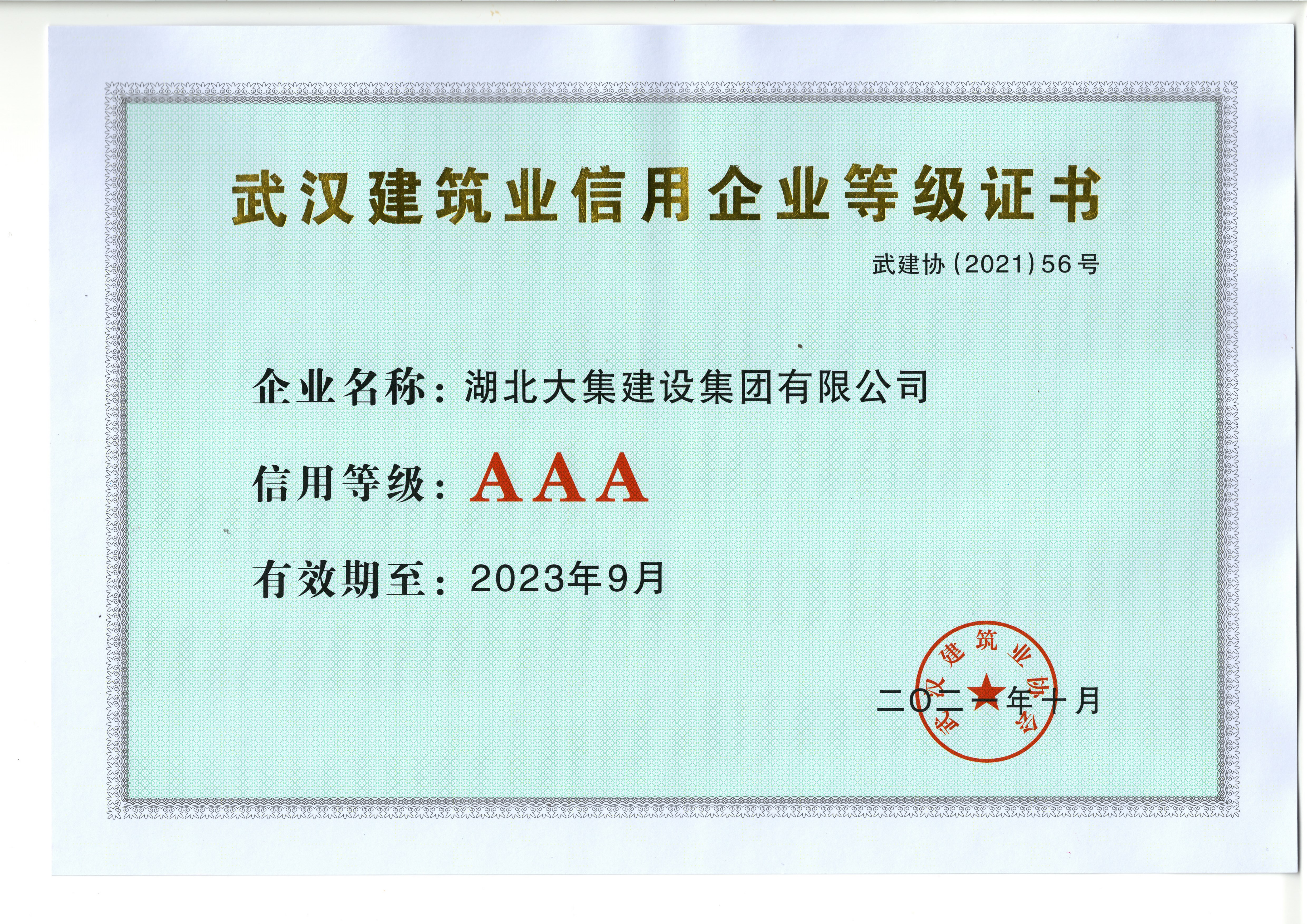 近日,武漢市建筑業(yè)協(xié)會發(fā)布2019-2020年度信用企業(yè)評價結(jié)果,湖北大集建設(shè)集團再次獲評“武漢建筑業(yè)AAA信用企業(yè)”。
